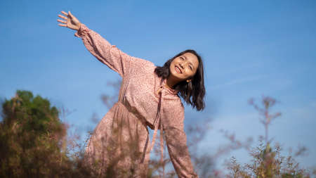 asian woman raising her arm while enjoying nature