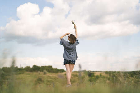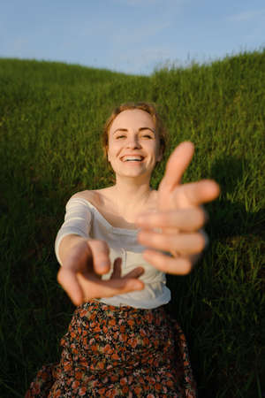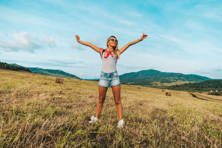 Young woman stretching up in a summer field. blonde girl raised her hands up with a joyful emotion on her face.