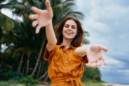 A happy woman on an island in nature reaches for the camera