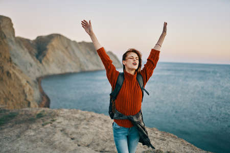 happy travel with hands up in the mountains near the sea in nature cropped view