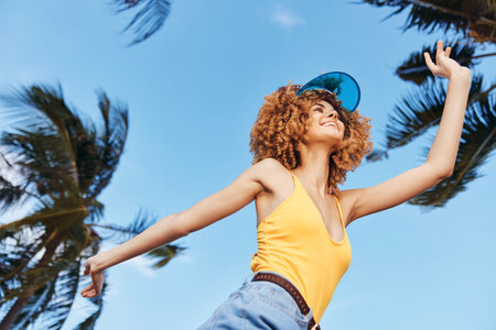 Happy young woman dancing outdoors under palm trees with a bright blue sky in the background