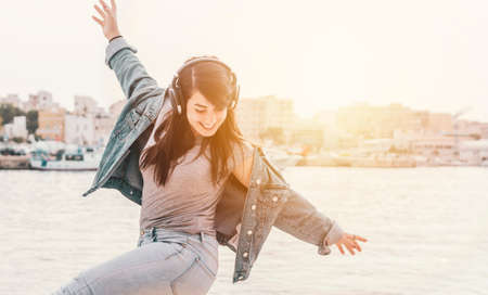 Young girl listen to music with headphones - Woman has fun dancing outdoors with the sea on the background - warm contrast filter