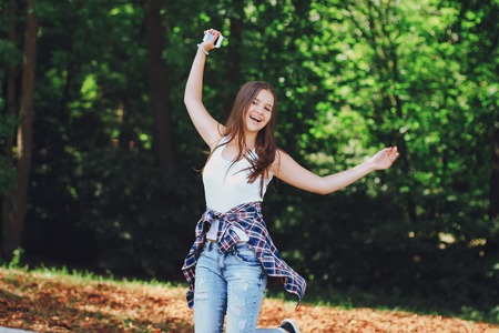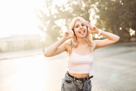 Cute fun girl listening to music on headphones in the city