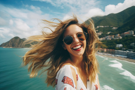 Happy young woman in sunglasses and white blouse with flying hair on the background of the sea, Sea and mountain view background, beautiful smile of tourist woman, AI Generated