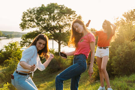 Three girls dancing with their smartphones at the park. Gen Z young girl friends using gadget and having fun outdoors. Kropivnitskiy, Ukraine, June 13, 2020.