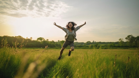 Generative AI : Happy woman jumping and enjoying life in field at sunset in mountains