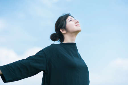 A young woman showing a relaxed expression under the blue sky