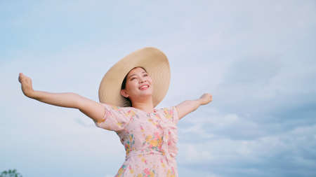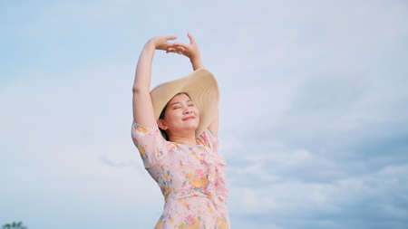 Portrait of beautiful Asian woman in hat relaxing with stretching.