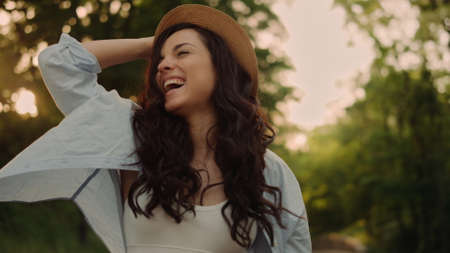 Happy joyful smiling woman spending her free time outside enjoying beautiful summertime weather.