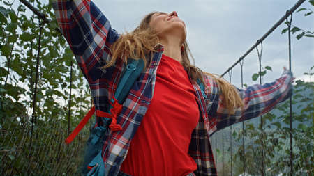 Euphoric girl hike jump at mountains nature. Cheerful woman express emotion outside. Smiling tourist raising hands in forest. Excited traveler feeling freedom in inspiring adventure. Leisure concept.