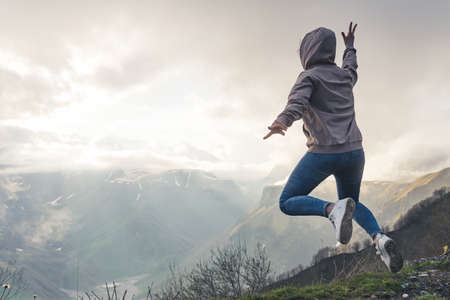 Trekking concept. Spontaneous brave person jumps in the air after seeing amazing mountain view. Happiness after physical activity. . High quality photo