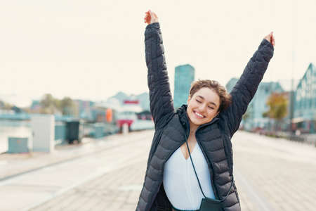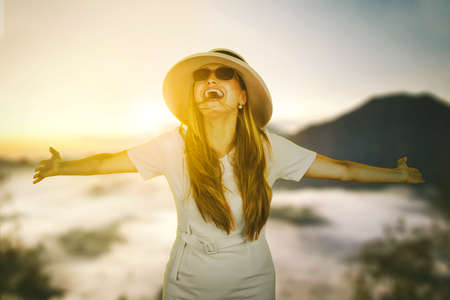 Young happy woman with her her hands raised up enjoying outdoor weather, golden hour