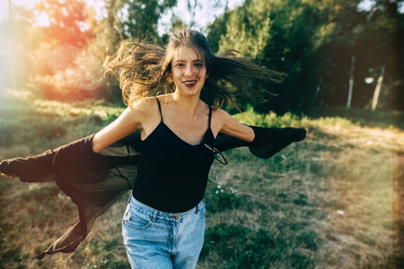 Stylish hipster girl having fun in sunny park in amazing sunbeams, atmospheric moment. Fashionable cool woman dancing and smiling in evening light. Selective focus. Retro effect. Creative image