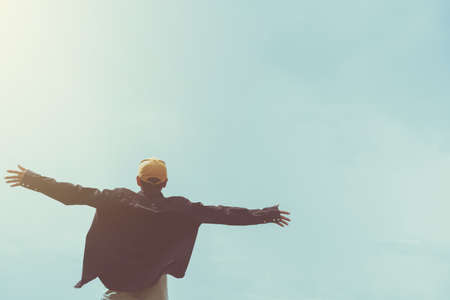 Copy space of man rising hands on blue sky white clouds abstract background. Freedom feel good and travel adventure concept. Vintage tone filter effect color style.