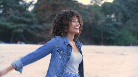 Healthy black woman standing on the beach with her hands outstretched with copy space. Happy young african american woman with open arms at seaside. Freedom girl dancing and daydreaming at beach during summer vacation.