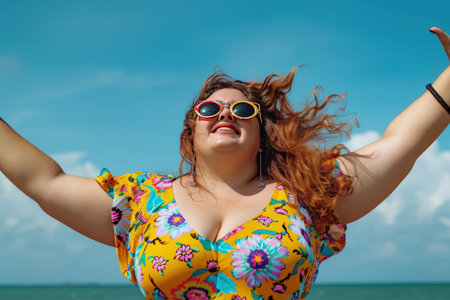 A plus-sized woman in a good mood wearing fashionable sunglasses and a colorful sundress dances happily,