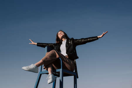 Happy young woman in black jacket sitting on chair with outstretched arms front of blue sky enjoying bright sunlight. Mental health, relaxation, freedom concept. Golden hour sunlight. Travel, airplane