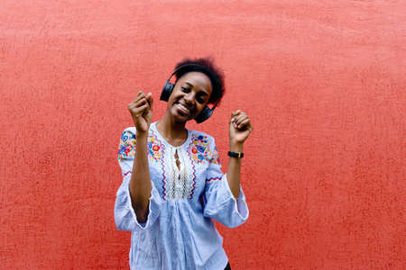 the beautiful African American listens to music on the street