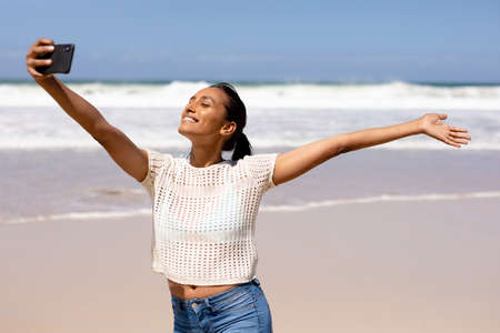 African american woman taking a selfie with smartphone on a beach by the sea. healthy lifestyle, leisure in nature.