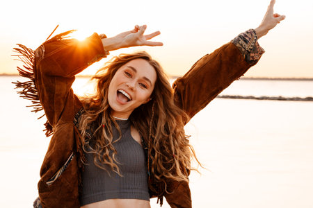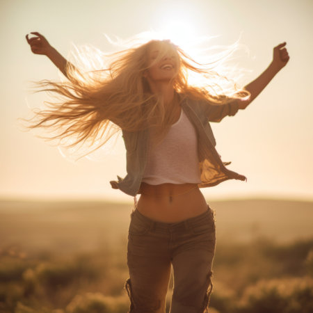 Joyful young woman enjoying a sunset with flowing hair in an outdoor setting during autumn