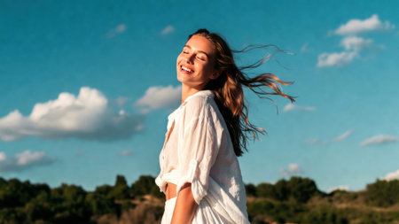 Joyful caucasian young adult female enjoying a sunny day outdoors.