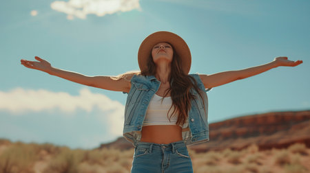 Young woman in cowboy hat and denim jacket with arms outstretched against blue sky