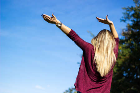 Cheerful young woman with hands raised towards sky. Young woman enjoying the nature view. Rear view