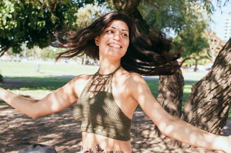 Female with curly hair, dressed in a floral shawl, stands outdoors with arms wide open, basking in sunlight, conveying a sense of happiness and connection to nature