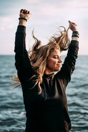 Summer vacation, happy smiling woman raising her hands up on the beach on sea coast background