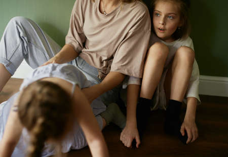 Mother and two funny daughters laughing and playing together. Sisters. Friendship. family relationships. green wall. natural light. love and happiness. Emotional and cute girls. Casual home clothes.