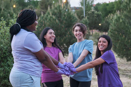 Group of multiracial active women smiling and putting their hands together after picking up trash in nature. Plogging concept.