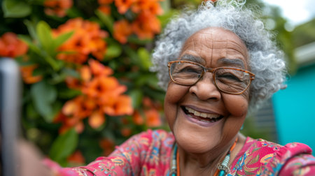 Portrait of a senior woman taking a selfie in the garden.