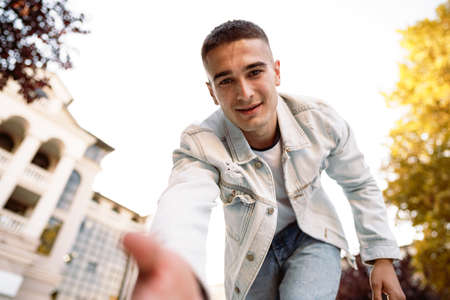 Portrait of young man taking a selfie while out on the city street, close up