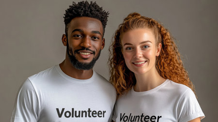 Portrait of a Happy Interracial Volunteer Couple, Wearing Matching T-Shirts on Grey Background.
