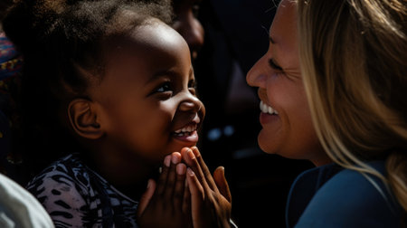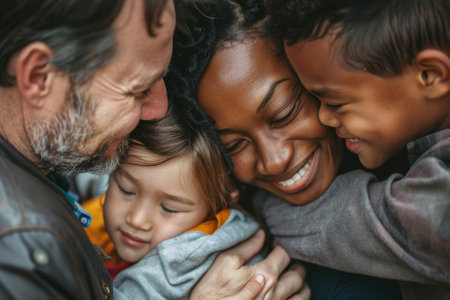 An adoptive family of different ethnicities sharing a hug, portraying the love and diversity in modern families.