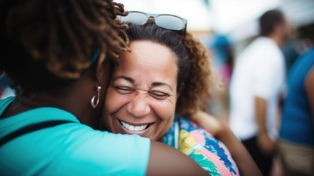 Two women embracing joyfully at a vibrant festival.. Generative AI
