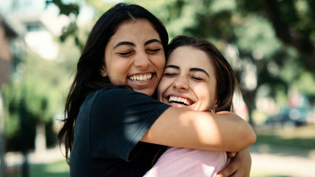 Joyful embrace: young hispanic females sharing a happy hug outdoors.