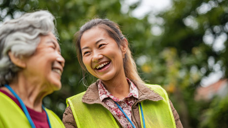 A volunteer and a senior community member share a joyful moment outdoors. Captured in a natural green setting, this wide-angle shot conveys a vibrant and hopeful atmosphere.