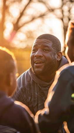 A man with a beard and a dark hooded sweatshirt is talking to a group of people in a park on a sunny day. His face is lit up by the sun as he gestures and talks to the group.