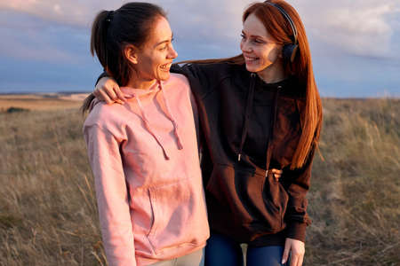 Portrait Of Excited Caucasian Women Posing At Camera, Having Rest After Jogging, Running Outside Of City, In Field At Sunrise, Laughing, Hugging, Looking At Each Other. Healthy Lifestyle, Sport