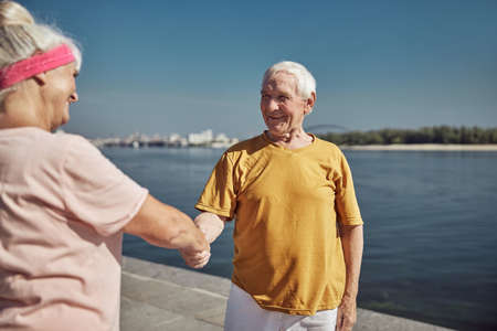 Pleased male pensioner shaking hands with a smiling lady wearing a headband and a t-shirt
