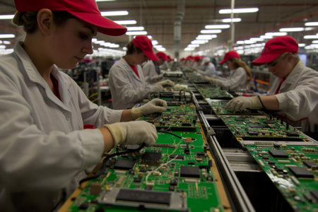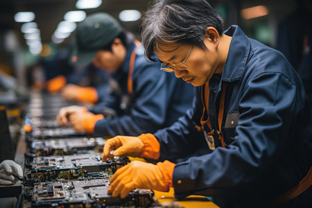 senior workers in a modern factory producing and assembling electronic high-tech components, Generative AI