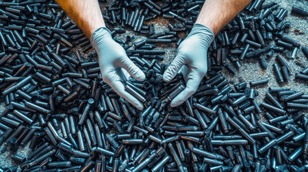 In a bustling ammunition depot, gloved hands meticulously collect shiny black 6.5mm bullets from a chaotic floor scattered with various objects, showcasing attention to detail.