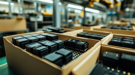 This image features an organized workspace in a factory, highlighting electronic components neatly stored in cardboard boxes. The industrial setting reflects modern manufacturing.