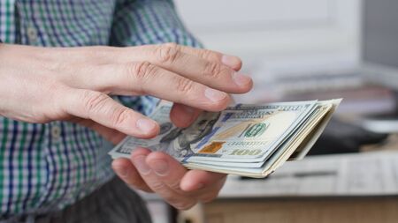 Close up of man hand counting 100 us dollar cash