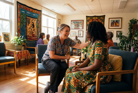 A cheerful female caregiver in patterned scrubs laughs while comforting a happy woman in a colorful african dress during a meeting in a diverse community center waiting room.