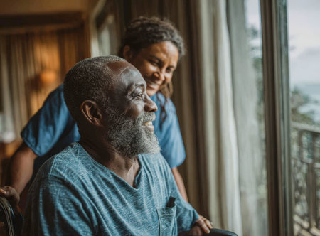 Healthcare worker supports senior man with walker in a warm room, filled with natural light and personal touches, emphasizing care and companionship
