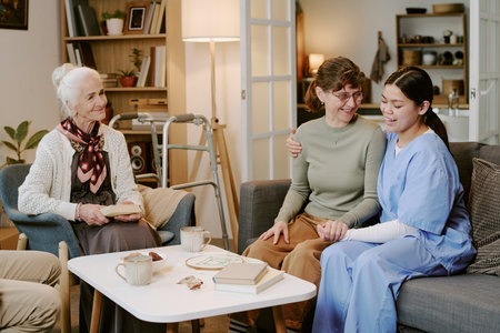 Senior Caucasian woman sitting on sofa holding book, middle aged Caucasian woman embracing young adult Hispanic female nurse, group interacting in living room setting