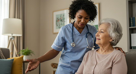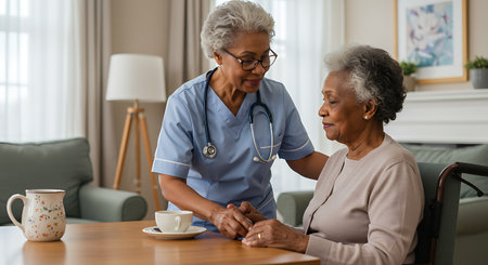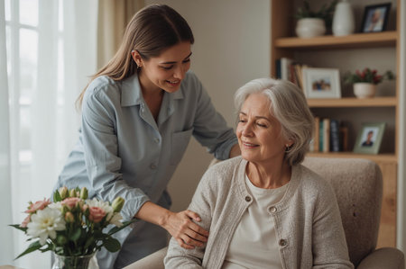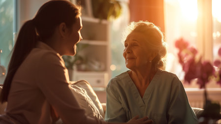 Caring interaction between caregiver and client cozy living room lifestyle image warm atmosphere friendly viewpoint compassionate connection