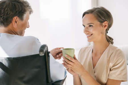 Young caring nurse helping older woman with a tea